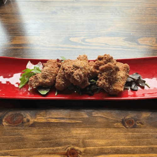 Six (6) deep fried chicken wings, tossed in our special seasoning, served on a bed of spring mix and drizzled with spicy mayo. A hot dish. This item requires 8 minutes to prepare