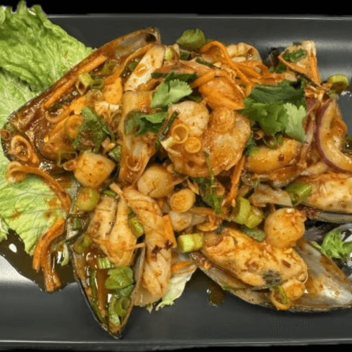 Shrimp, calamari, mussels, and scallops tossed in yum sauce, mixed with shredded carrots, red onion, cilantro, and scallions. Served on a bed of spring mix. This item requires 15 minutes to prepare
