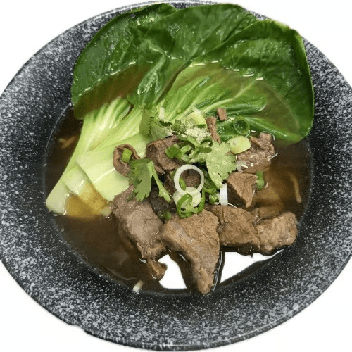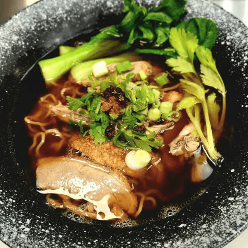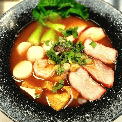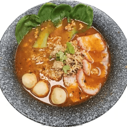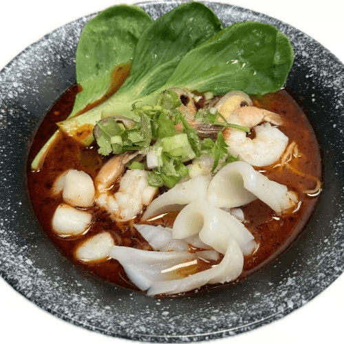 Flat rice noodles with roasted pork, shrimp, calamari, fish balls, fried tofu, and bok choy in a fermented soybean pink soup. Topped with fried wontons. This item requires 15 minutes to prepare