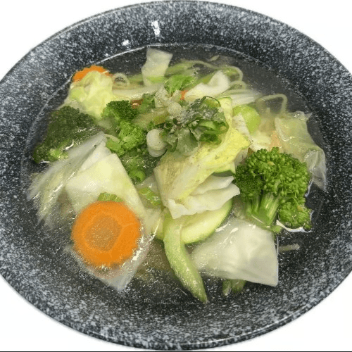 Chicken broth clear soup with napa cabbage, cabbage, carrot, celery, broccoli and zucchini. This item requires 5 minutes to prepare