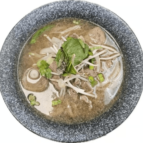 Thin rice noodles with sliced beef, beef balls, yellow onions, bean sprouts, and Thai basil leaves