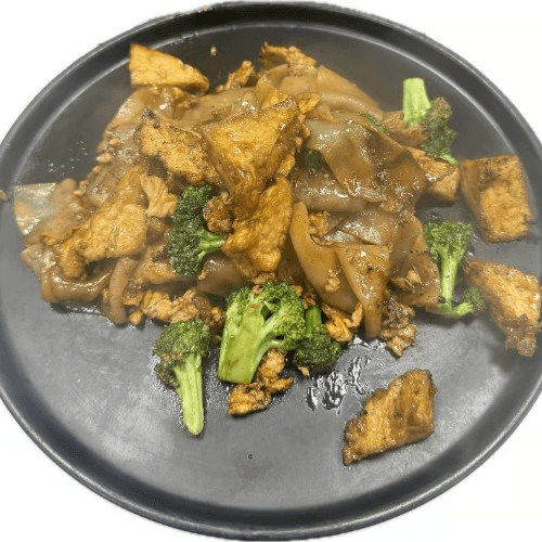Stir-fried flat noodles with your choice of protein, broccoli, and eggs in a Thai style soybean gravy sauce. Contains egg