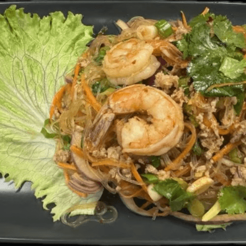 Shrimp, ground pork, and glass noodles, tossed in yum sauce, mixed with shredded carrots, red onion, cilantro, and scallions. Served on a bed of spring mix. This item requires 15 minutes to prepare.