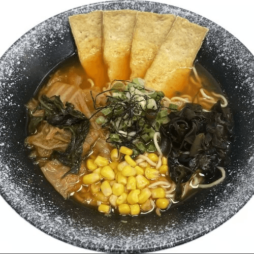 Kimchi soup with soft fried tofu, kimchi, corn, black fungus, seaweed, and scallions. A hot dish. This item requires 10 minutes to prepare