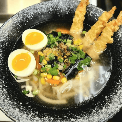Udon noodles with shrimp tempura, carrots, seaweed, and corn