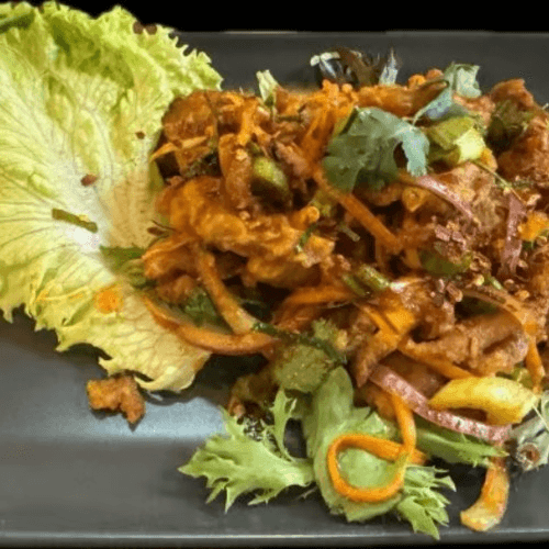 Crispy roasted duck, tossed in yum sauce, mixed with shredded carrots, red onion, celery, cilantro, and scallions. Served on a bed of spring mix. This item requires 15 minutes to prepare