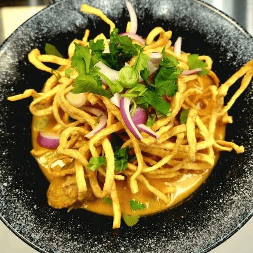 Fried egg noodles with a chicken drumstick and thigh in yellow curry with red onions, scallions, and cilantro
