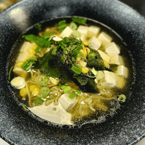 Yellow curry ramen with fried, diced tofu. Topped with fried noodles, red onions, scallions, and cilantro. Served with veggie broth!
