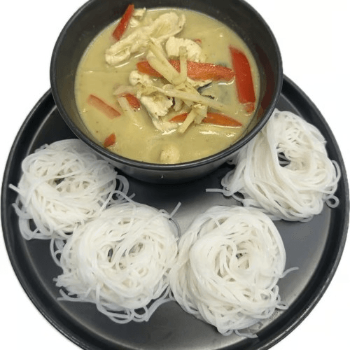 Served with vermicelli noodles, not rice. Green curry with your choice of protein, bamboo, red bell peppers, and Thai basil. A hot dish