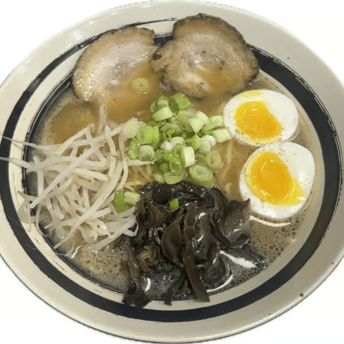 Pork bone broth soup with chashu pork, boiled egg, bean sprouts, black fungus (mushroom), and scallions. This item requires 15 minutes to prepare