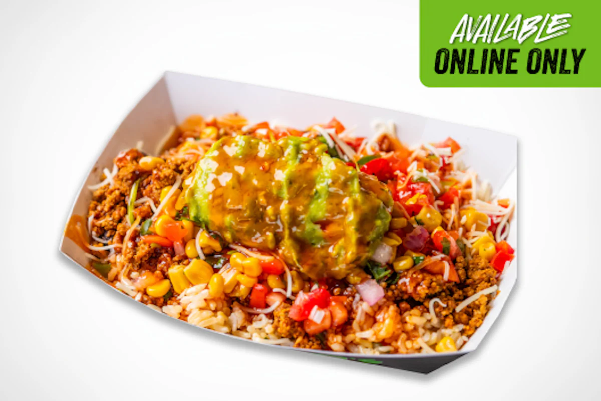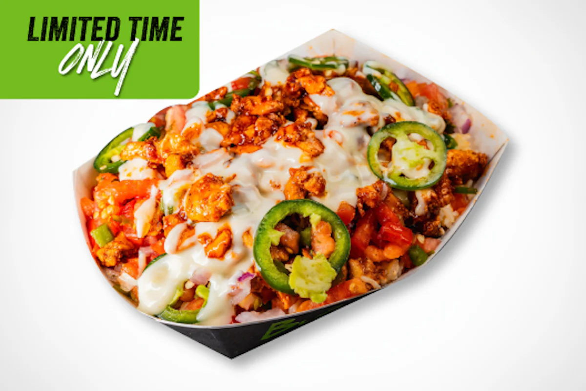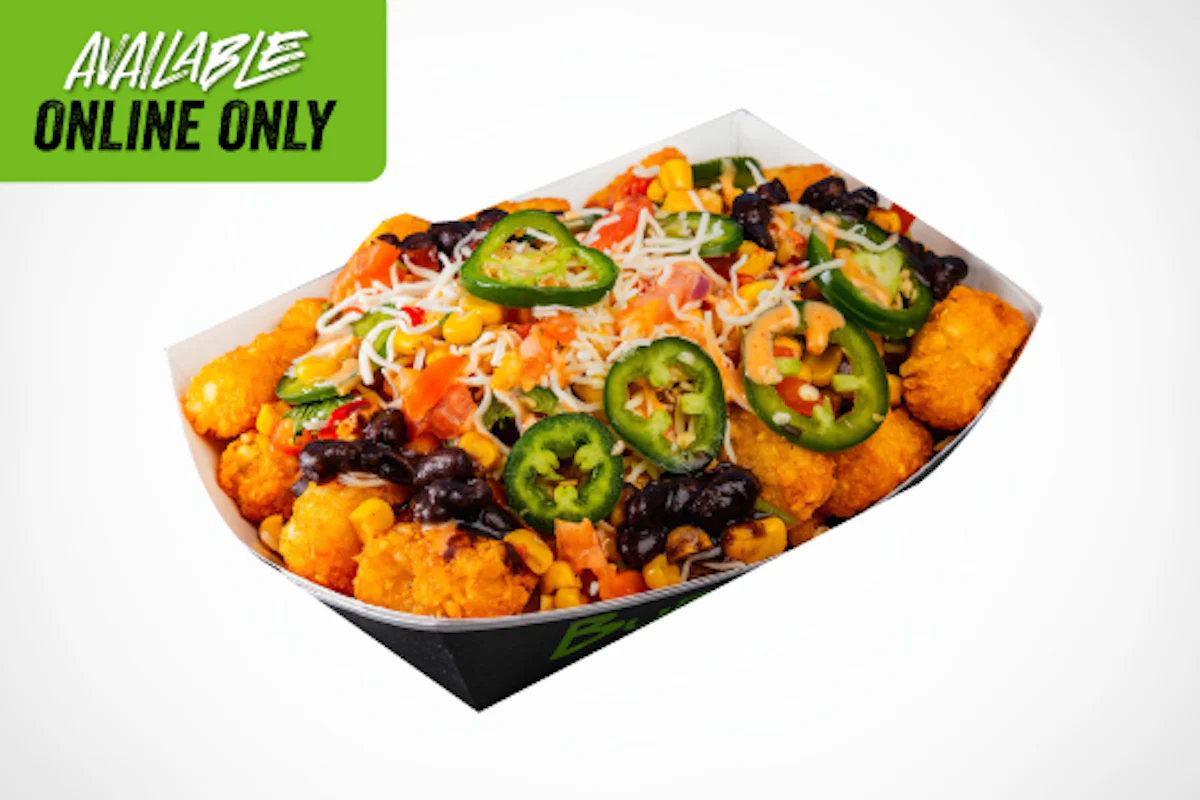 Crispy, colorful, and packed with flavor. Golden tater tots are piled high with sautéed fajita veggies, black beans, melty cheese, fresh pico de gallo, and a drizzle of your choice of flavor.