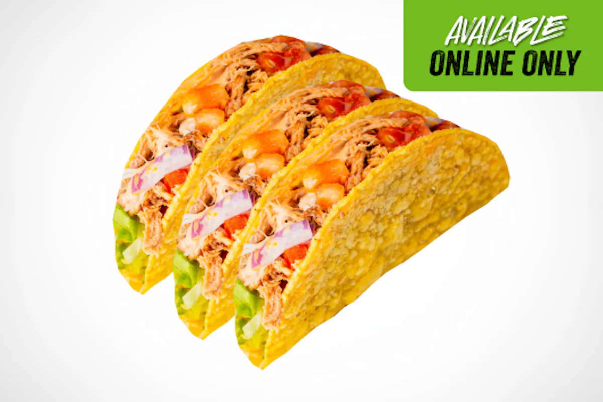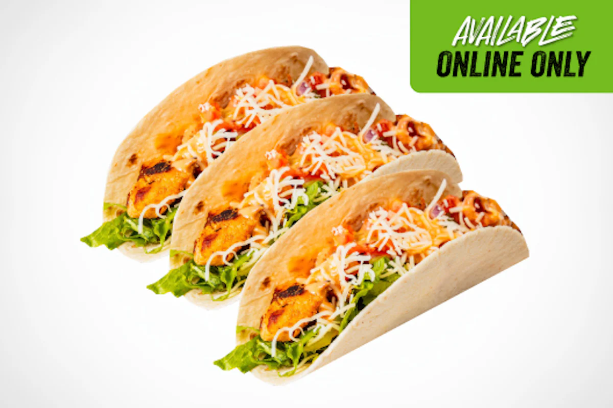 Crispy, cheesy, and packed with bold flavor. Three soft tacos loaded with grilled or crispy chicken, grilled bacon, melty cheese, pico de gallo, crisp lettuce, and a drizzle of spicy sriracha ranch.