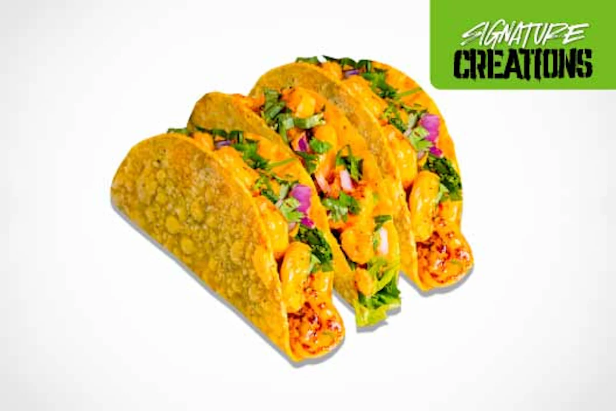 Crispy, spicy, and totally crave-worthy. These tacos feature grilled shrimp tossed in our signature Boom Boom sauce, cilantro, red onion, and lettuce all tucked into (3) crunchy hard shells. Chips and salsa are served on the side.