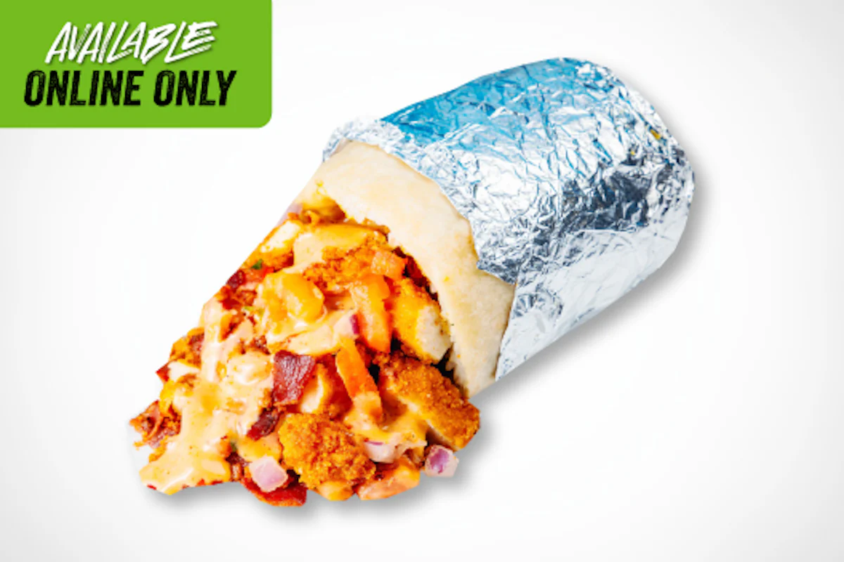 Crispy, spicy, and loaded with flavor. This burrito is packed with fried chicken or grilled chicken, grilled bacon, pico de gallo, lettuce and shredded cheese, all drizzled with creamy sriracha ranch and wrapped in a warm tortilla.