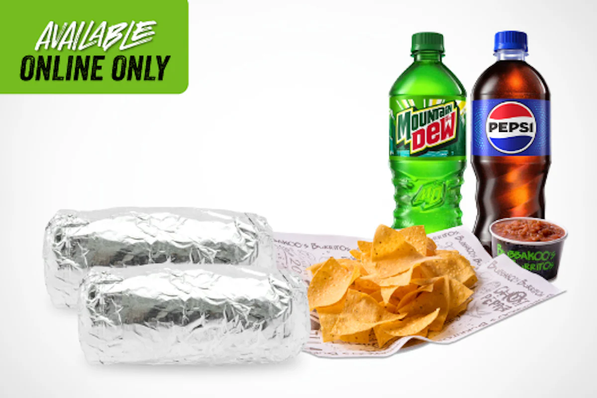 Double the flavor, double the fun. Grab two of your basic favorite burritos—loaded with fresh ingredients, bold flavors, and all the crave-worthy toppings—plus chips, salsa and beverage, all for just $30. Perfect for sharing, meal prepping, or just treating yourself (and a friend).